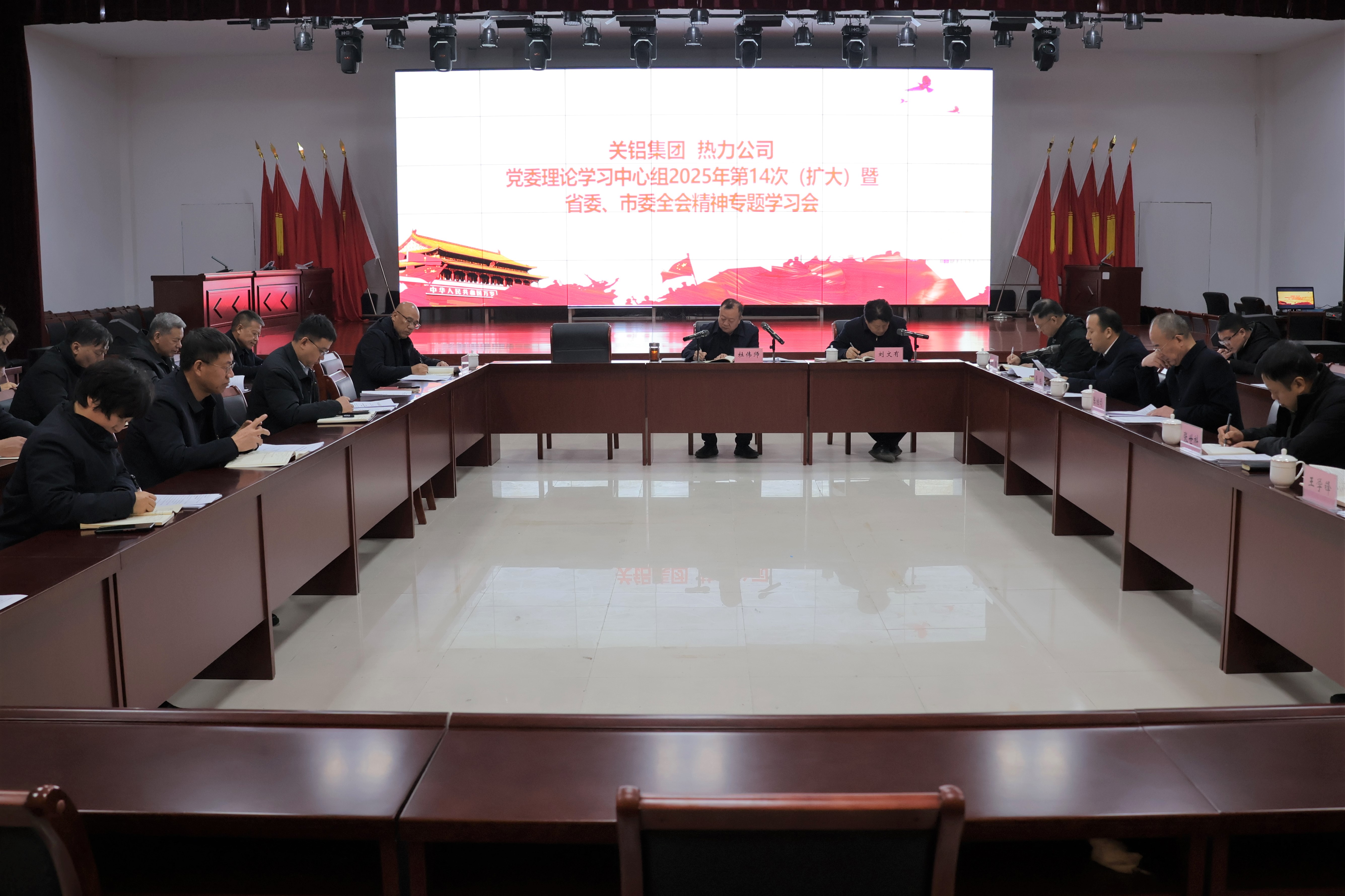 12月26日上午,公司联合关铝集团召开党委理论学习中心组2025年第14次(扩大)会暨省委、市委全会精神专题学习会。会议由公司党委书记、董事长杜伟师主持,关铝集团、热力公司领导班子成员,各党支部书记、中层正职及部门负责人参加会议。