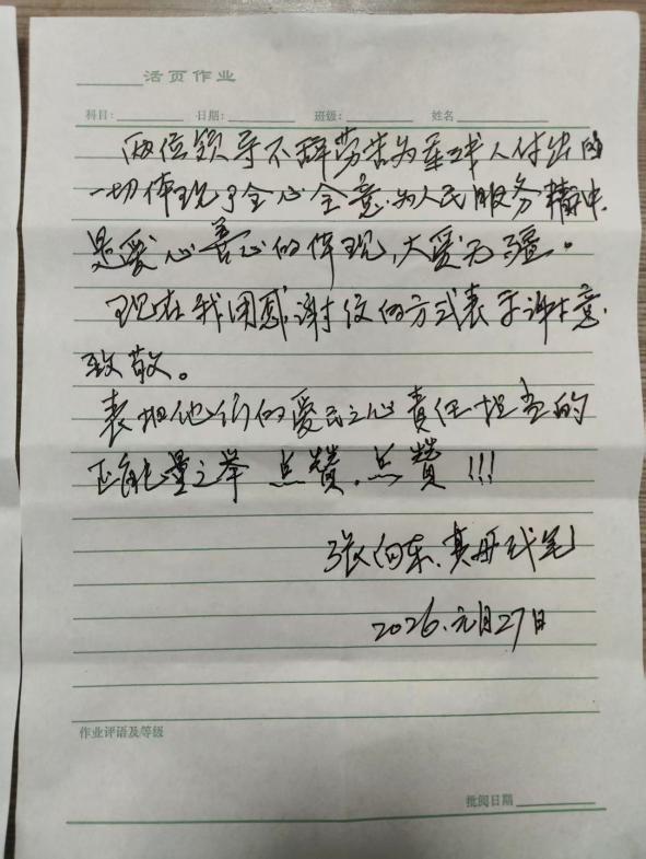 从入户的故障排查、管道清洗、密封窗户到赠送生活物资,王强强和胡红娜的每一个举动,都被张向东看在眼里、记在心里。因无法用言语清晰表达感激,他特意拜托母亲代笔,写下这封感谢信,为热力“贴心人”点赞。王强强和胡红娜表示,他们将继续关注辖区内的孤寡老人、残障人士等特殊群体,并列为供热运行重点服务对象,供暖期定期上门回访,用贴心、暖心的服务,把温暖送到每一位群众的心坎上。