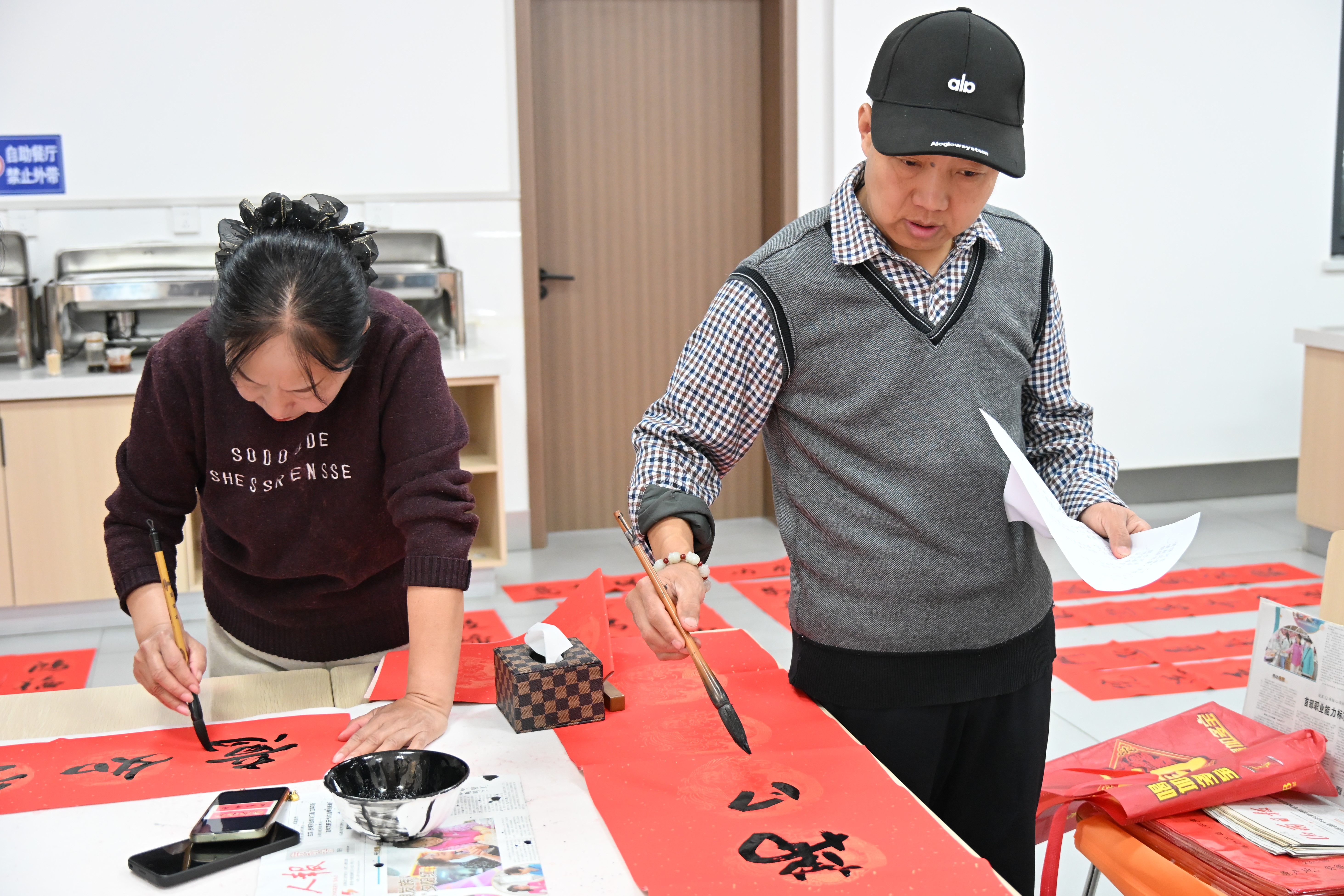 一张张铺展的大红宣纸整齐排列,笔墨砚台一一就位,书法家们凝神聚气,挥毫泼墨间笔走龙蛇。楷书端庄大气,行书流畅飘逸,隶书古朴厚重,各具特色的书法风格将马年吉祥寓意与热力人坚守奉献的职业精神巧妙融合。“金马踏春输暖韵,初心筑梦惠民生”“骋马扬鞭兴热力,春风送暖入千家”“福满热力全家福,春归河东万象新”,一副副对仗工整、寓意深远的春联跃然纸上,既饱含着对新年的美好期许,也彰显着运城热力服务民生、温暖万家的责任担当。一个个饱满圆润的“福”字,笔力遒劲、喜气盎然,将新春的祝福与满满的暖意凝于笔端、落于纸上。